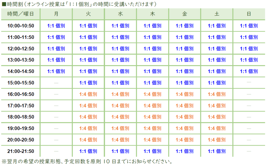 1コマ50分の授業です。50分ごとに10分間の休憩時間を取り、軽く体を動かしたり、飲み物を飲んだりする機会を持ちます。